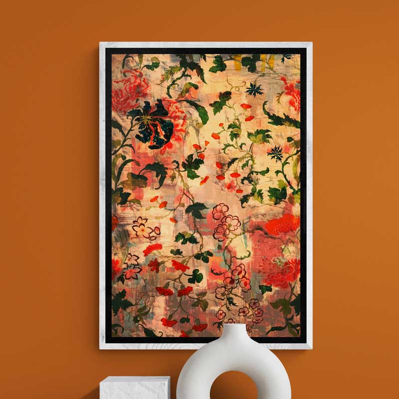 Decorative floral art in red and earth tones of acrylics, oil sticks, and ink by Jinx Davis. This printable art is High Resolution and can be printed as big as 24x36in | 70x100cm (300 DPI). Zip file includes sizes 12 x 18, 16 x 24, 20 X 30, 24 x 36, A1, A2, A3