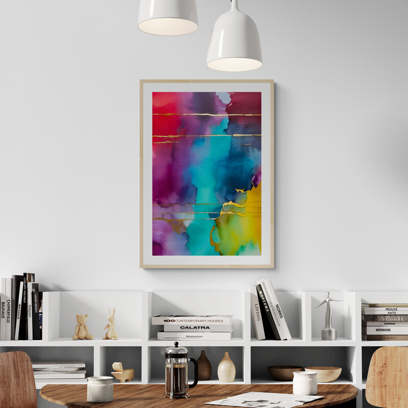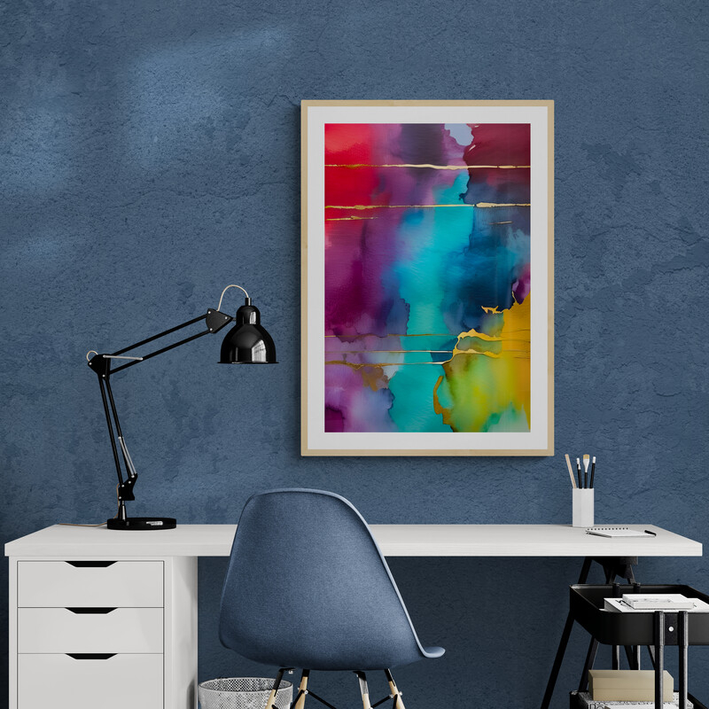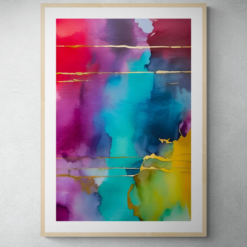 This bright-colored abstract with sparkling gold streaks will be handsome in any room. This is the 3rd in a series of 4 paintings. It is available in High Resolution and can be printed as big as 24 x 36 | (300 DPI). The zip file includes 24 x 36 in, 16 x 24 in, 12 x 18 in, 8 x 12 in, and 5 x 7-inch sizes. I will resize it for you at your request. We suggest downloading immediately upon receiving your files.